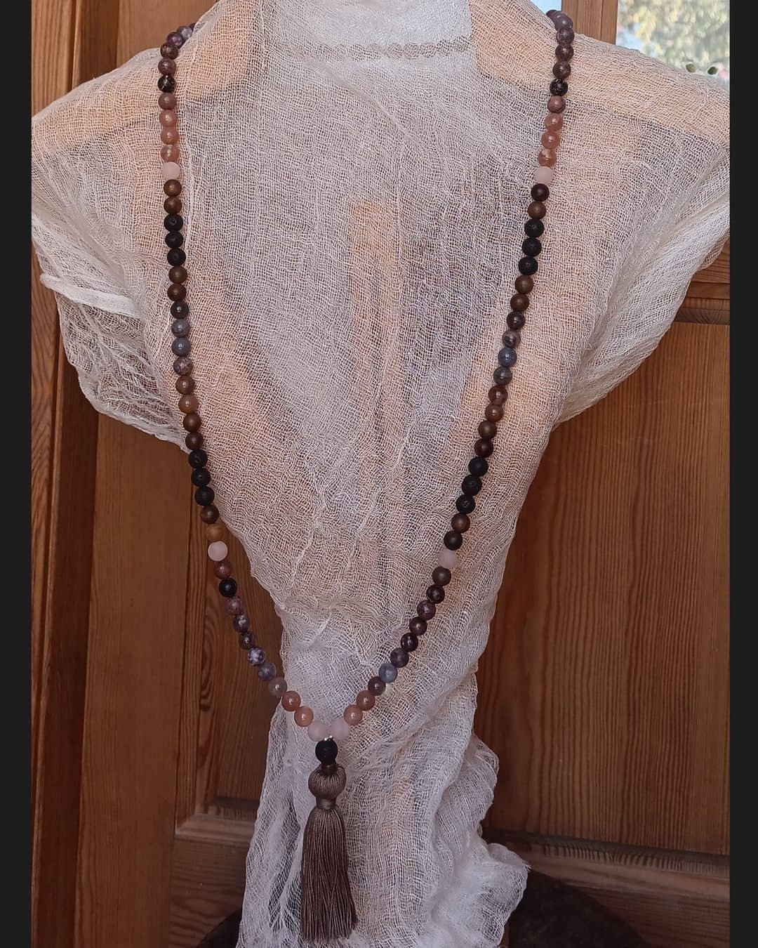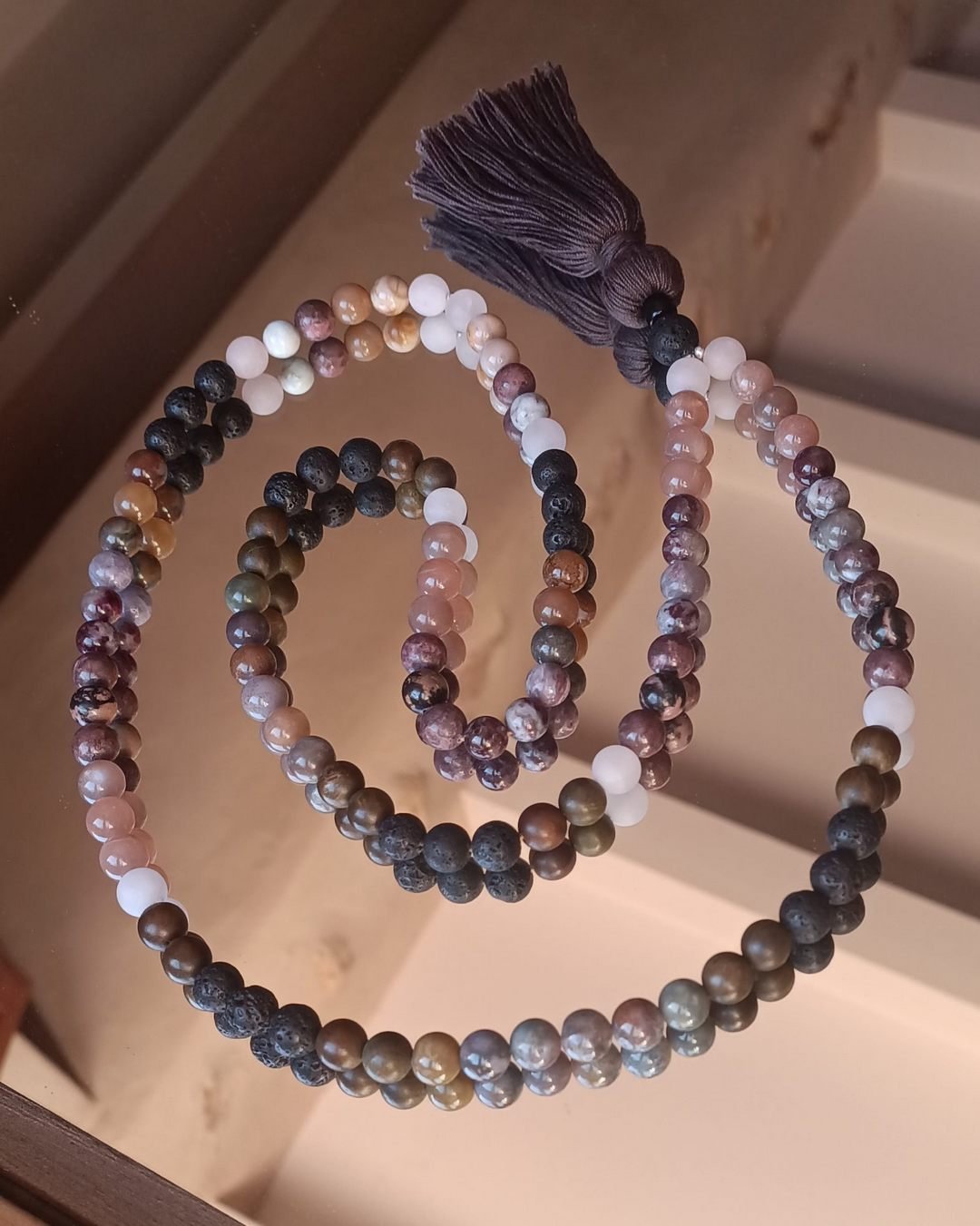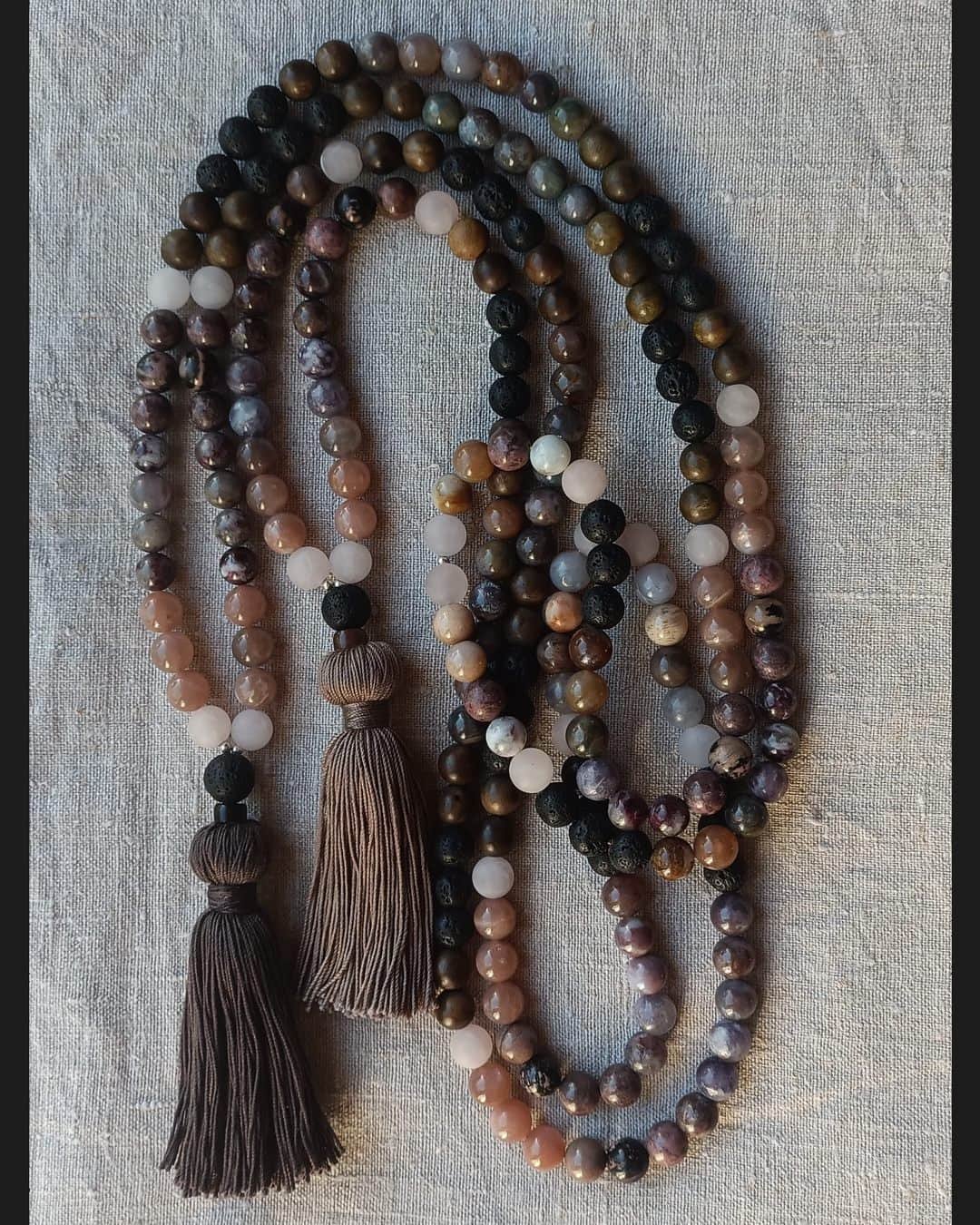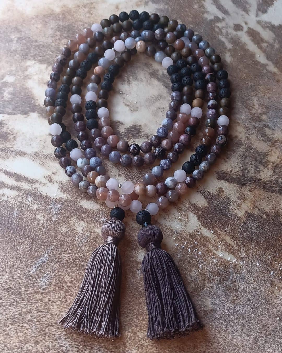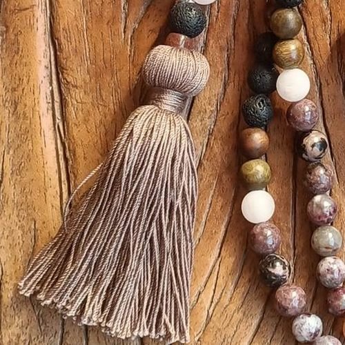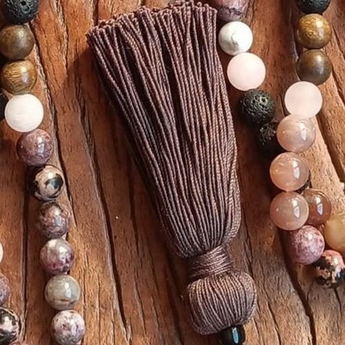• 108 perles de pierres naturelles de 10mm, 2 perles de Tourmaline de 4mm, 1 perle du Guru en Pierre de Lave 12mm, 1 perle tube en Obsidienne, 1 pampille en fil de coton caramel