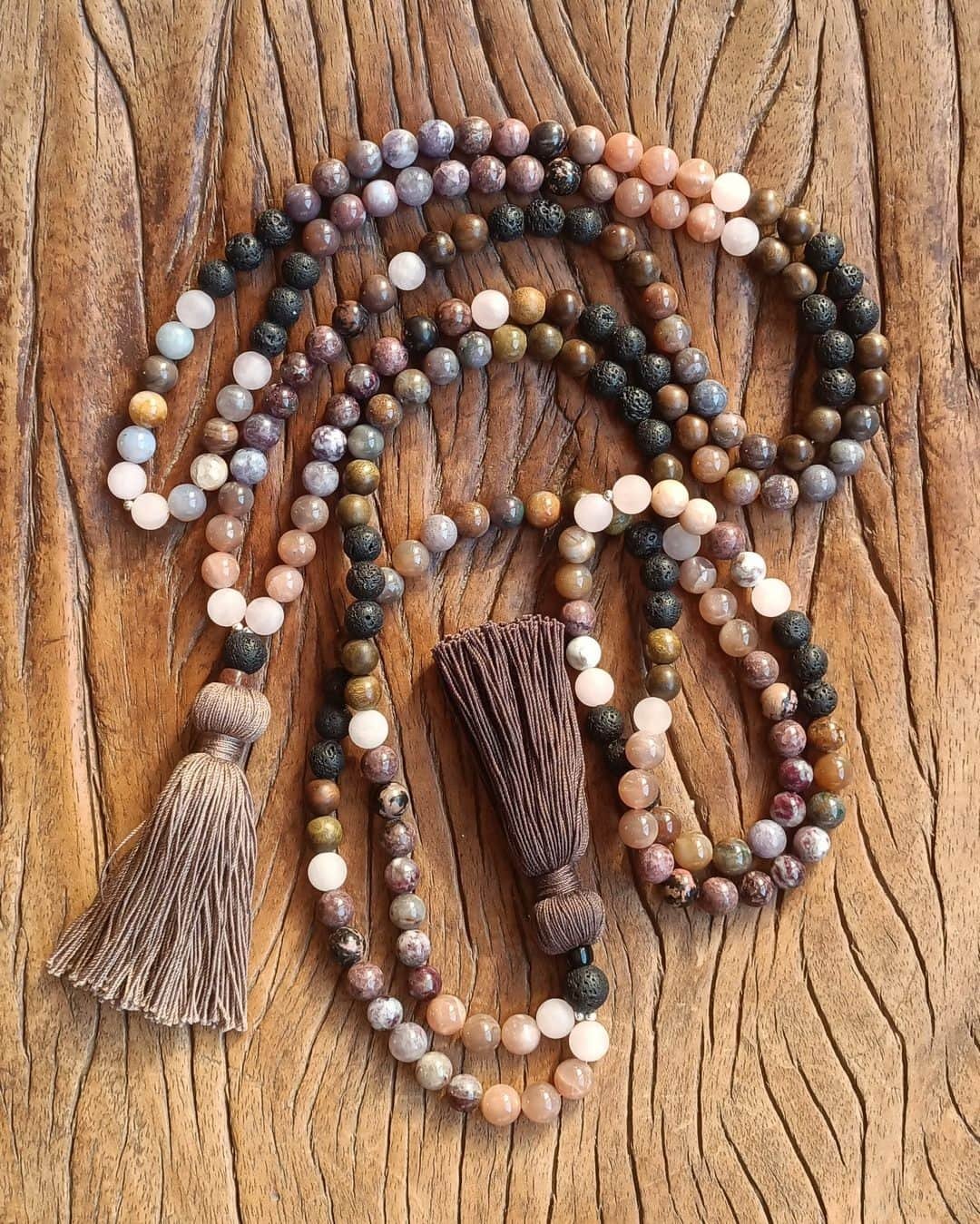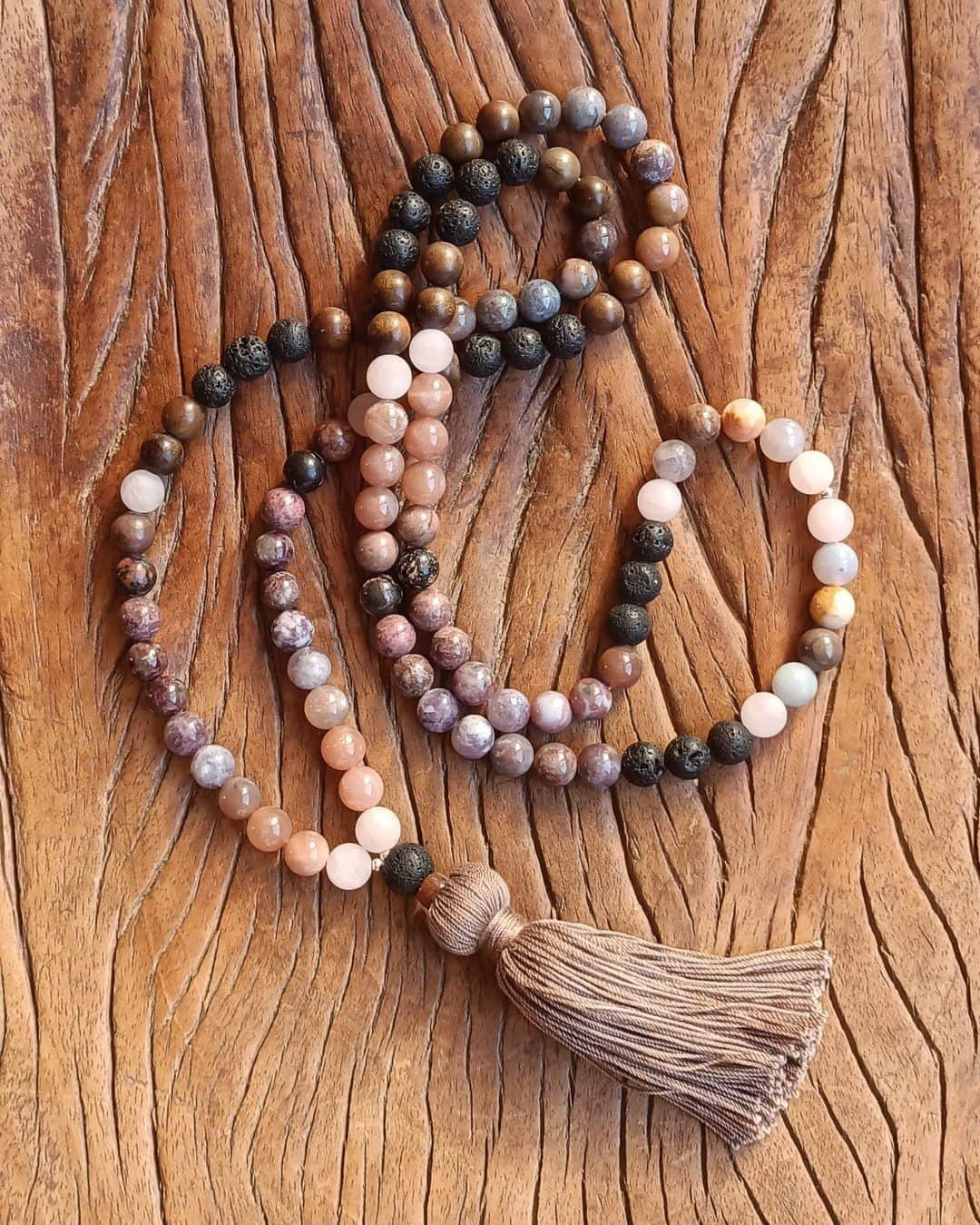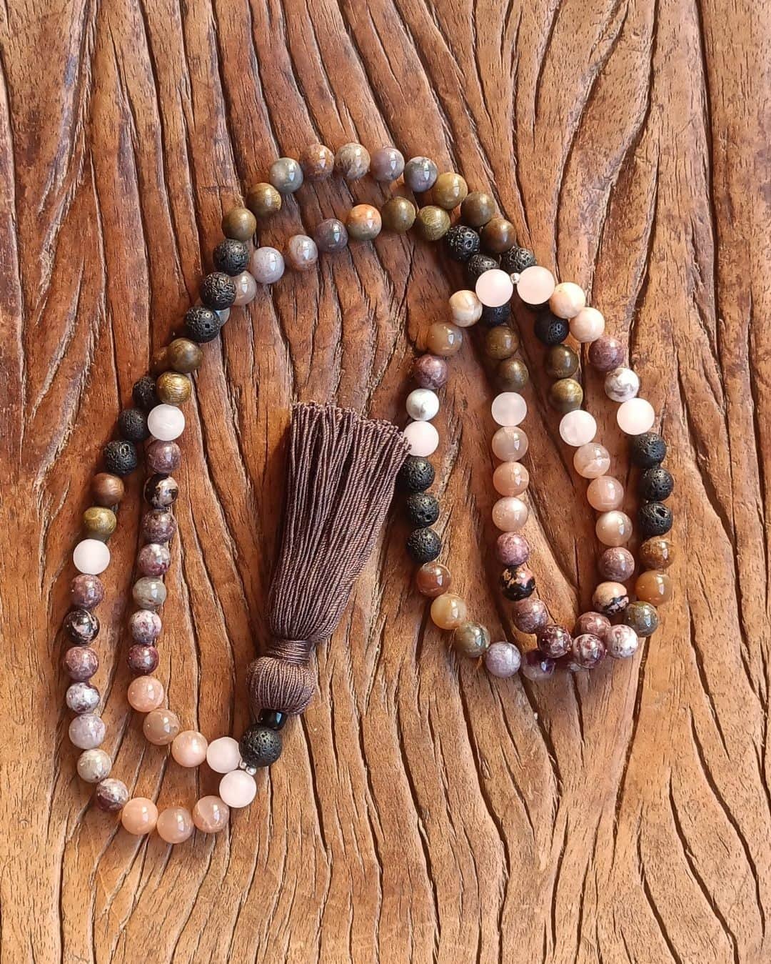 Ce Mala unique combine six pierres et du bois aux propriétés complémentaires :