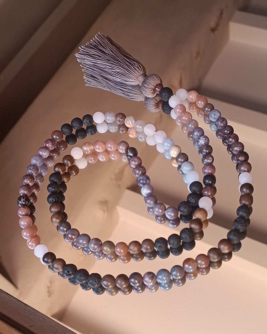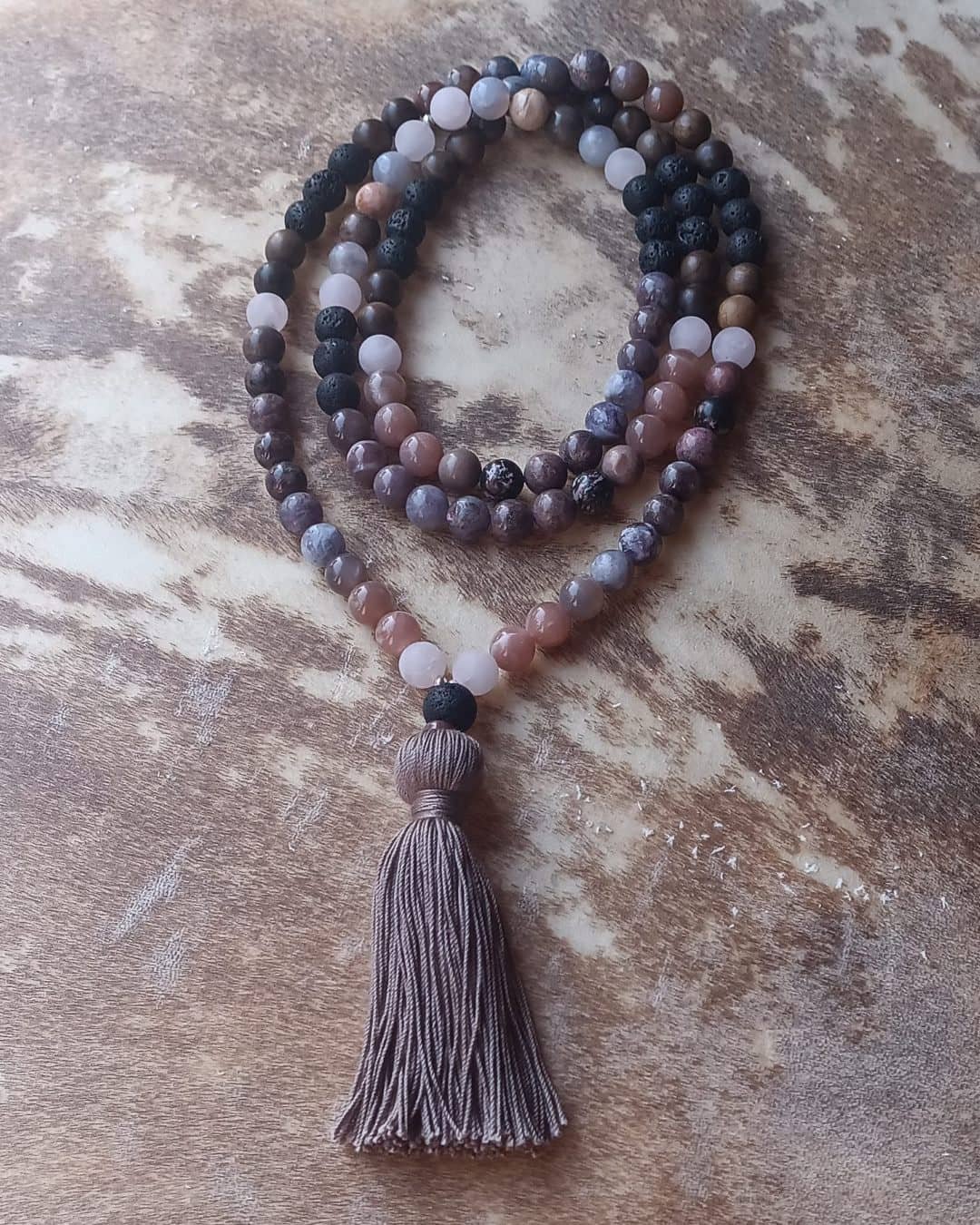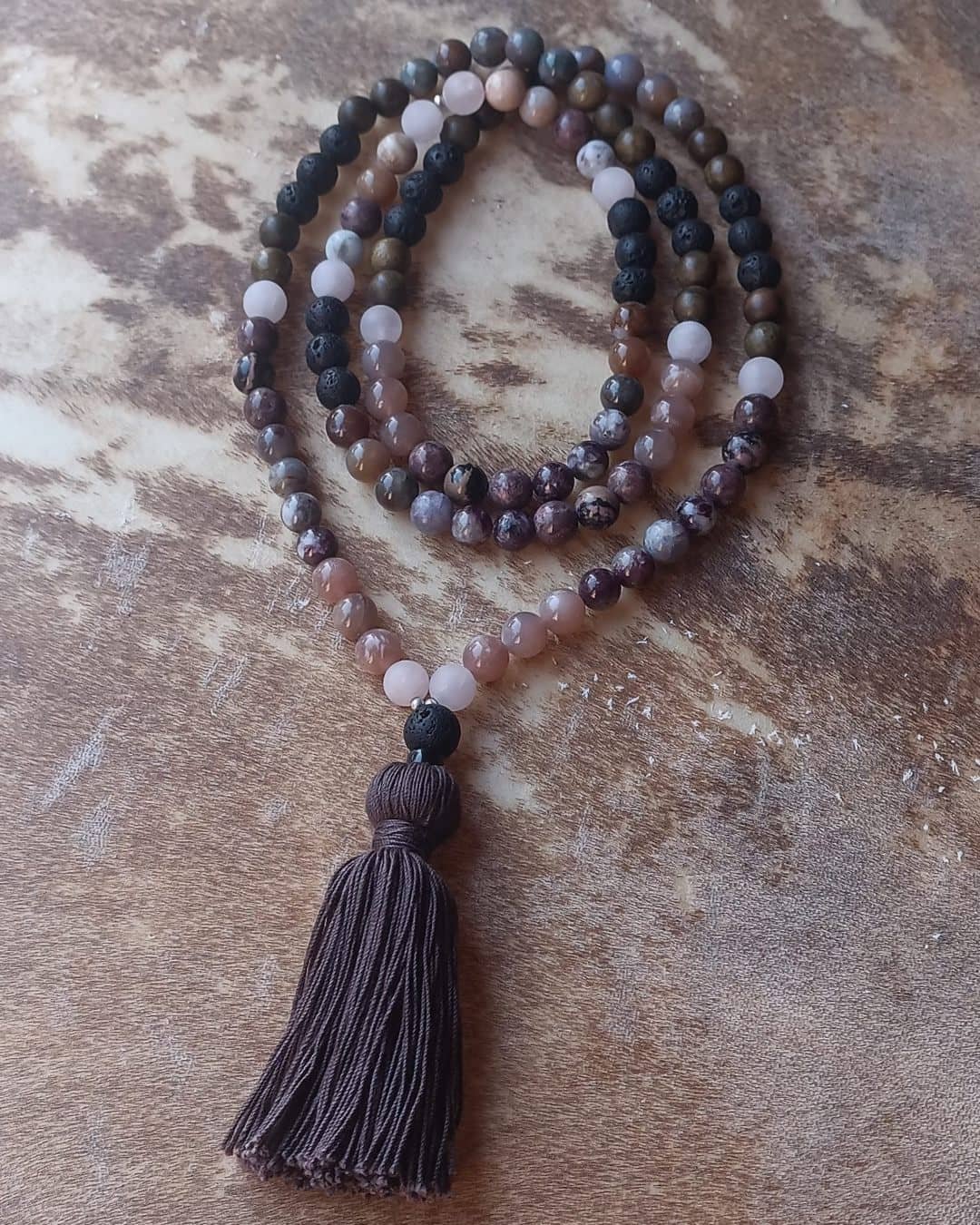 Ce Mala unique combine six pierres et du bois aux propriétés complémentaires :