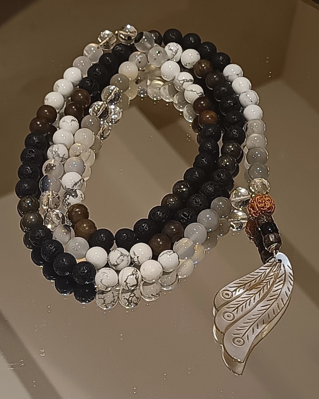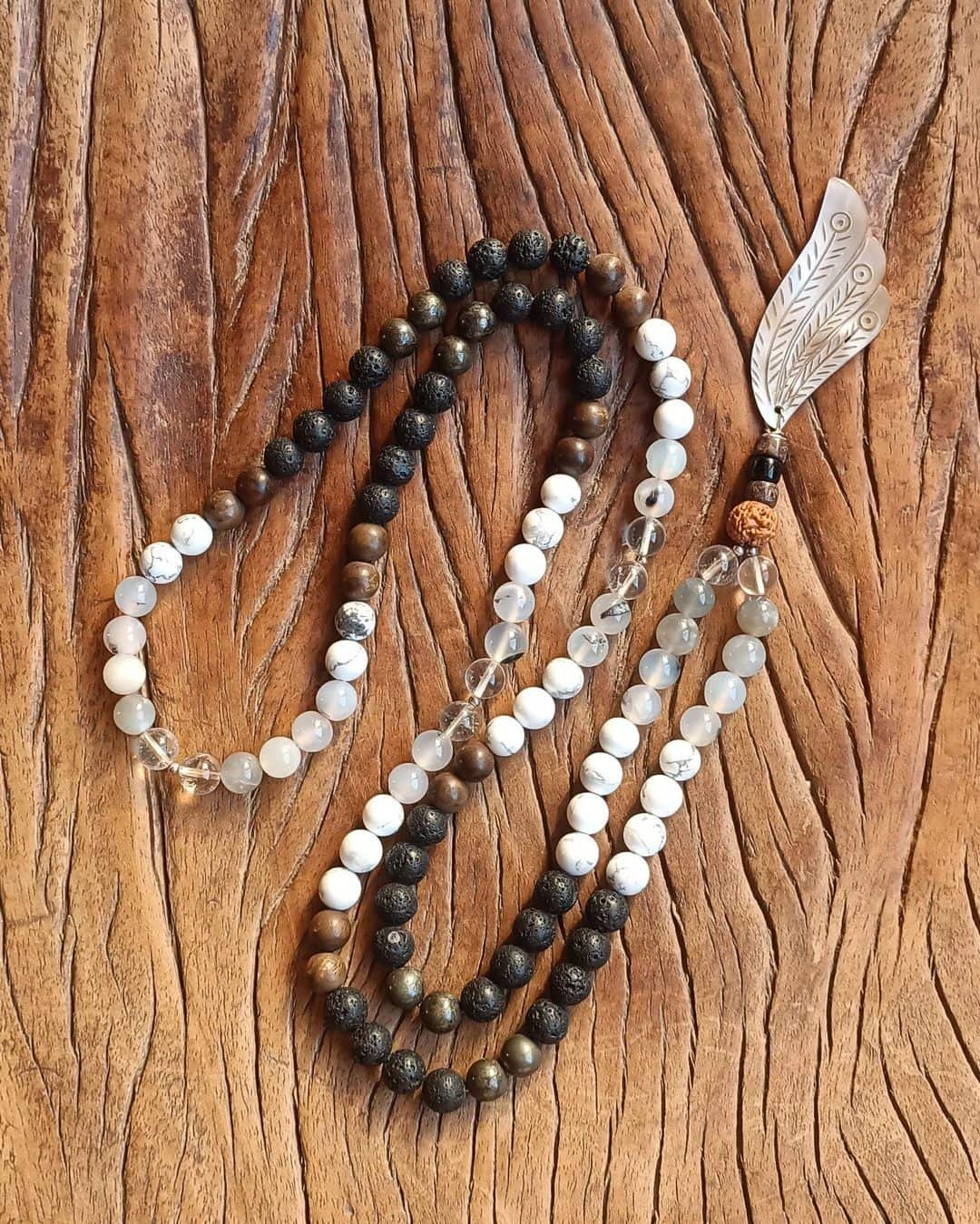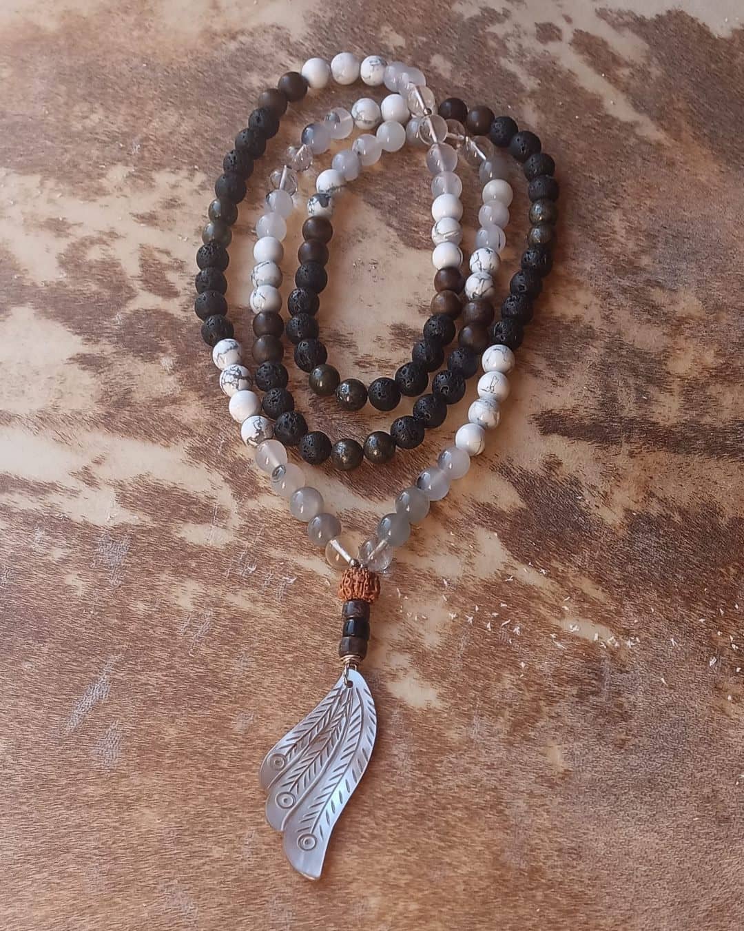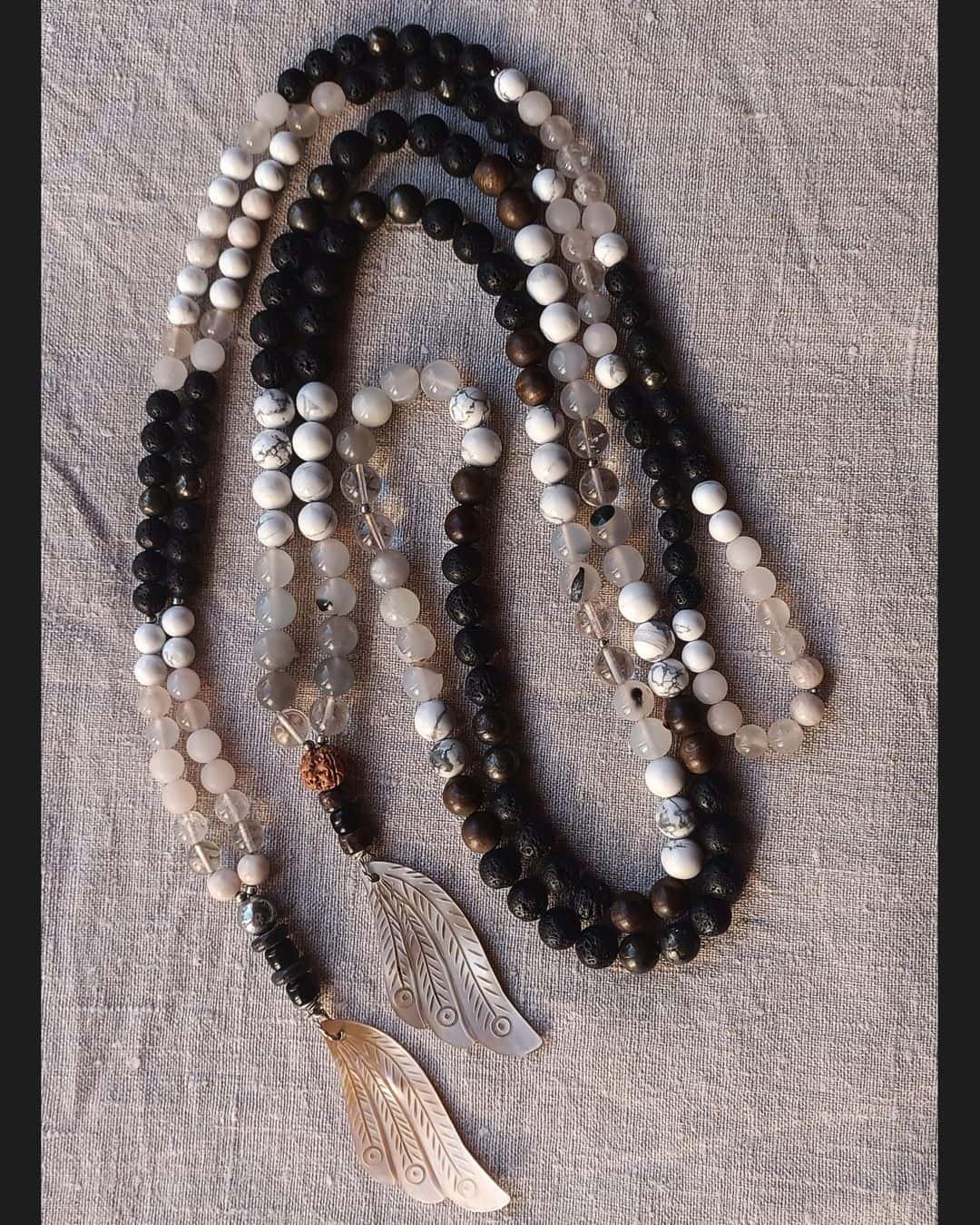 • 108 perles de pierres naturelles de 10mm, 5 perles d’argent massif de 3mm, 1 perle du Guru rudraksha, 3 perles tube d’obsidienne, un pendentif « Aile d’Ange » en coquillage