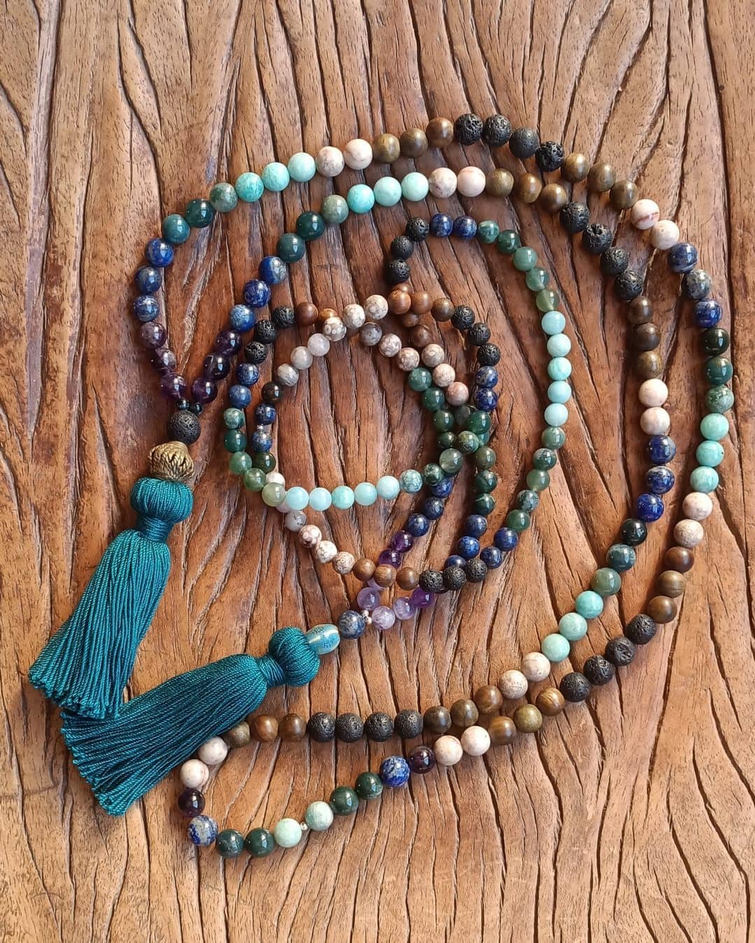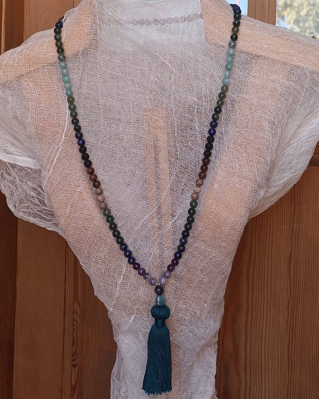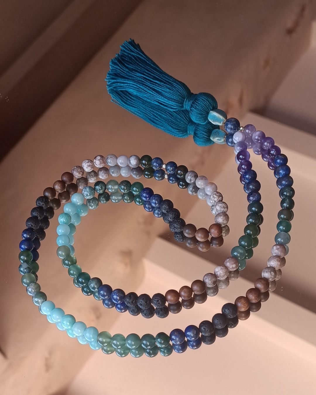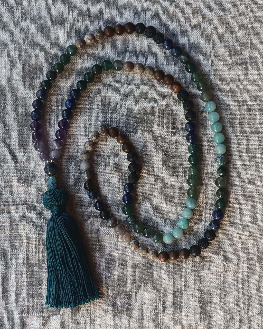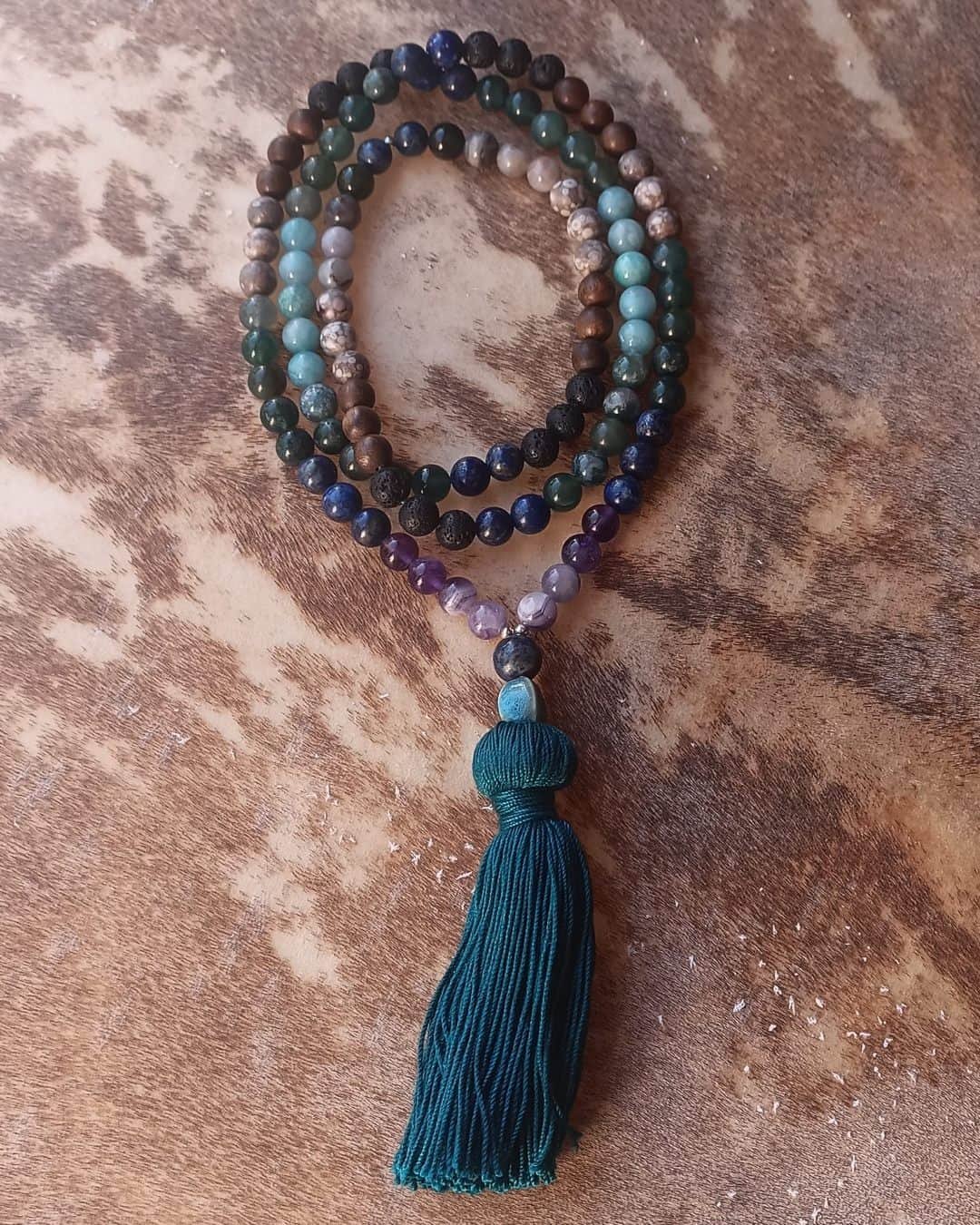 Chaque Mala « Entre Ciel et Terre » est unique, créé avec respect et composé de matériaux naturels, qui peuvent donc présenter de légères variations de couleur et texture.