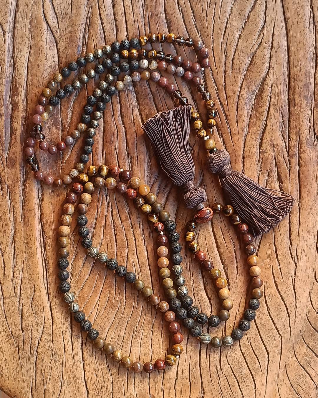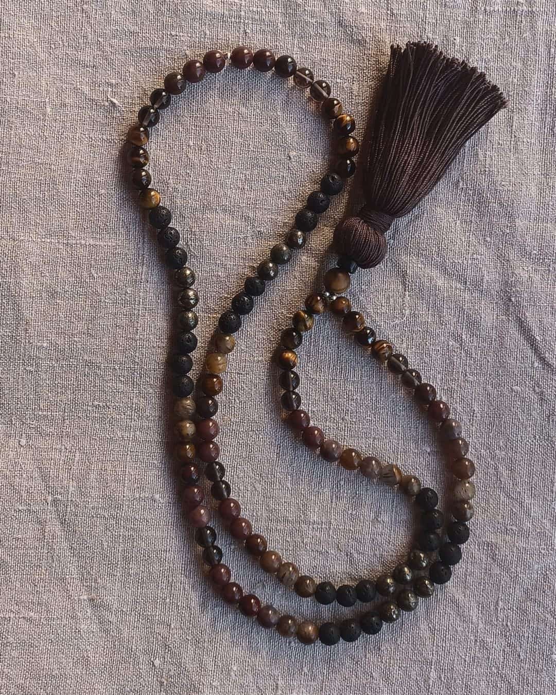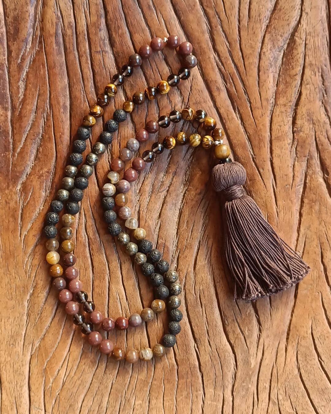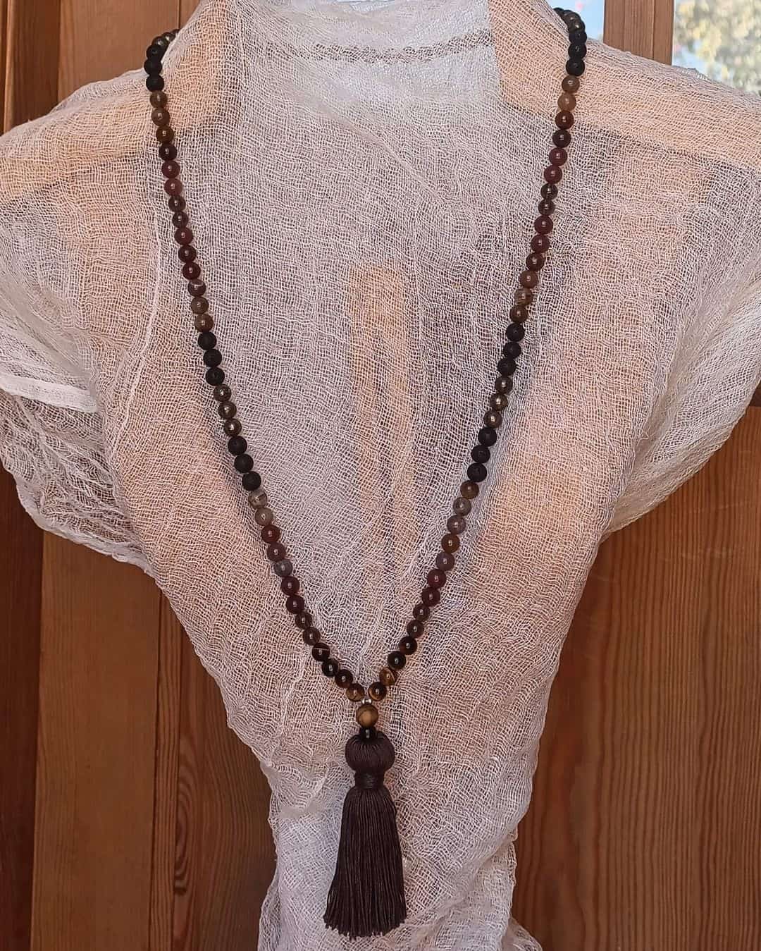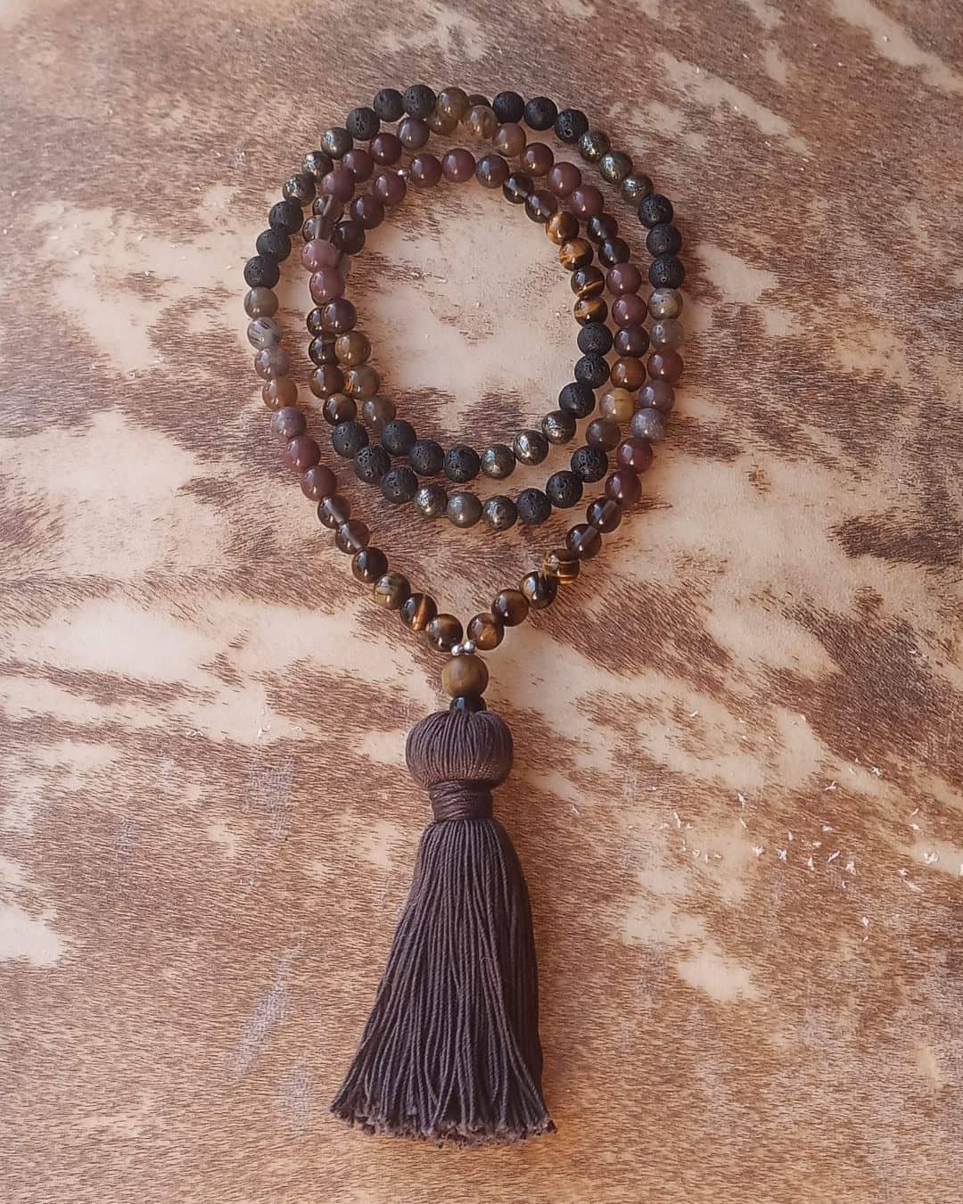 • 108 perles de pierres naturelles de 8mm, 3 perles en argent massif 3mm, 1 perle du Guru en Œil de Tigre, 1 perle tube en Obsidienne, 1 pampille en fil de coton café