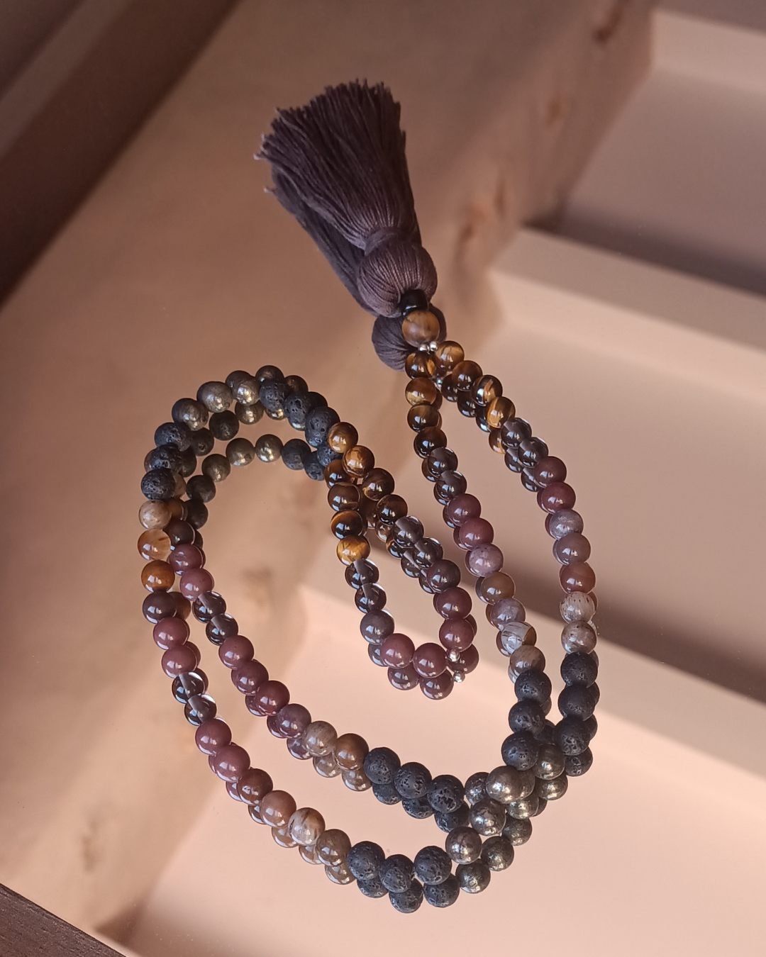Ce mala à l’esthétique tribale combine six pierres aux propriétés complémentaires :