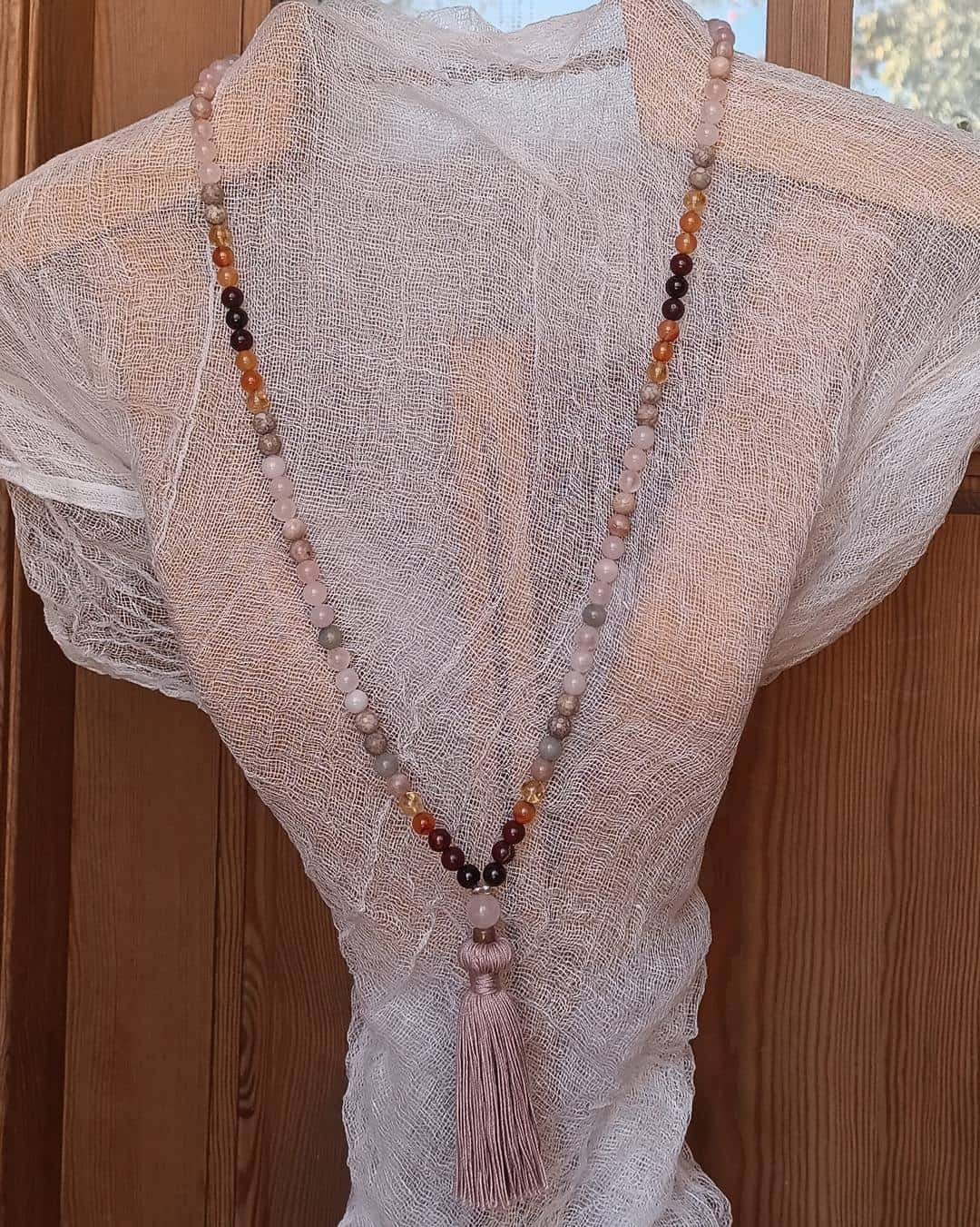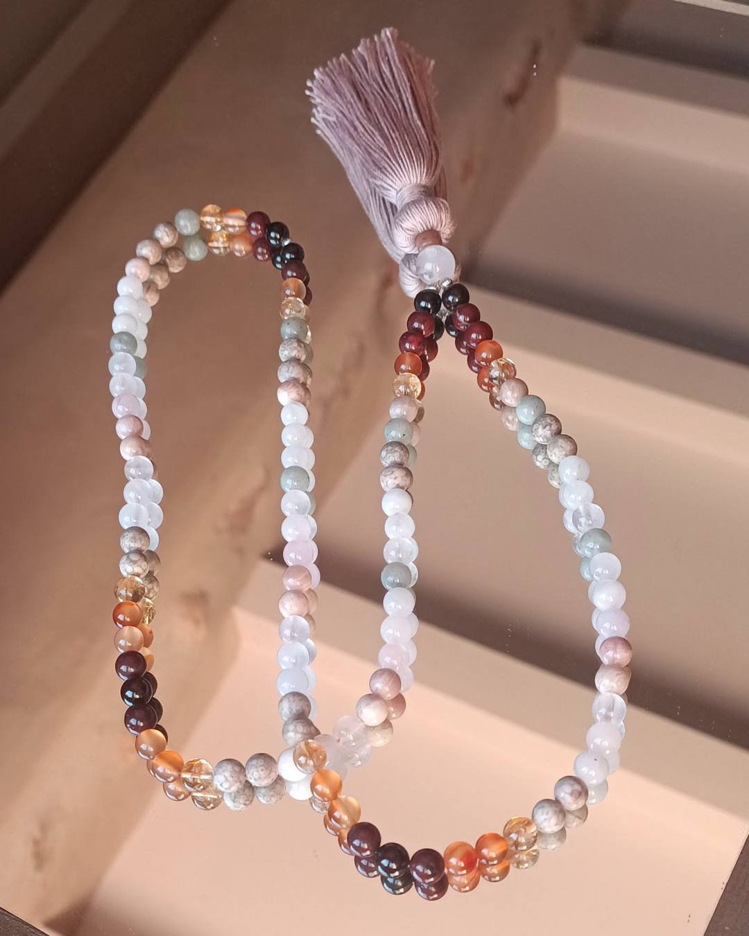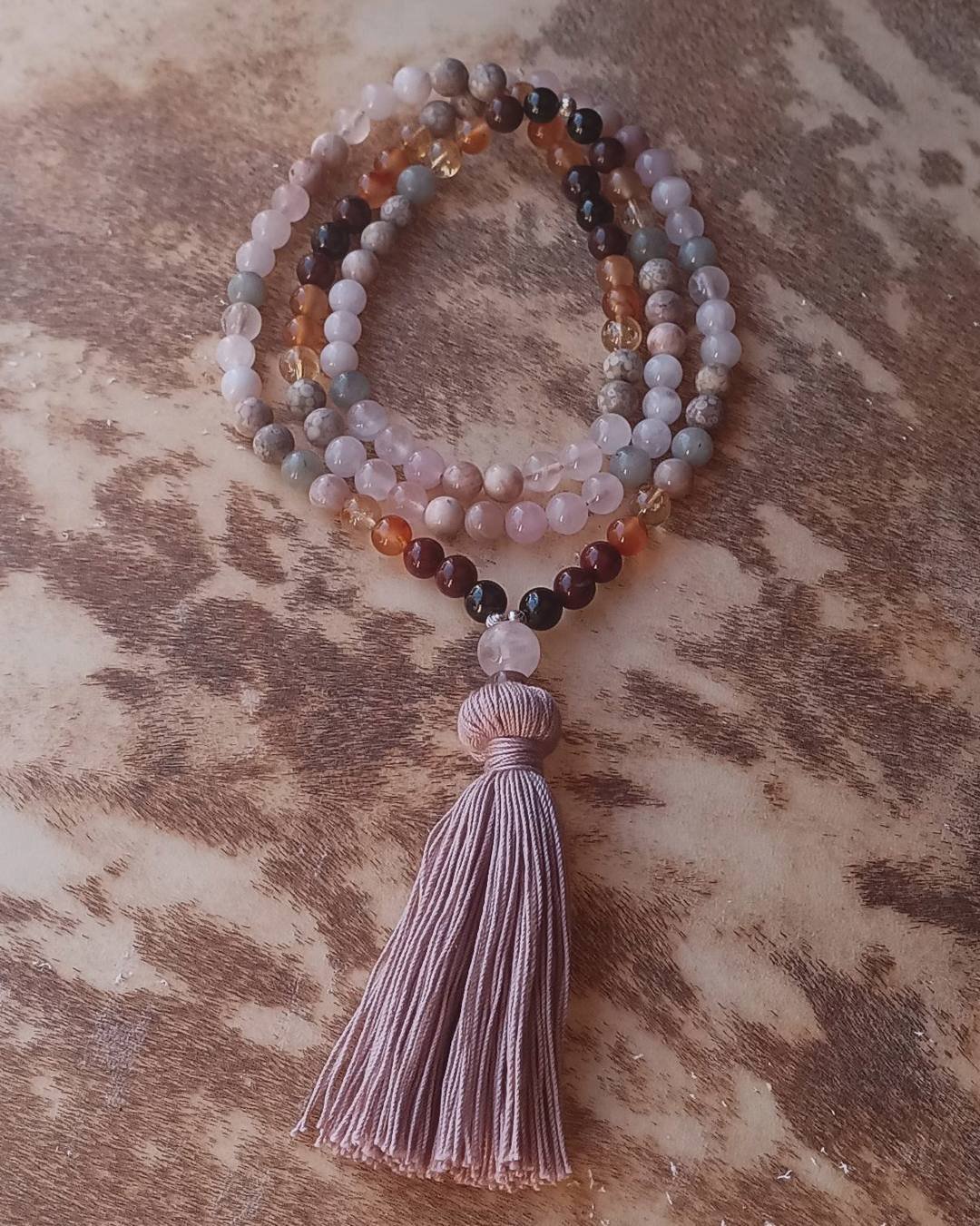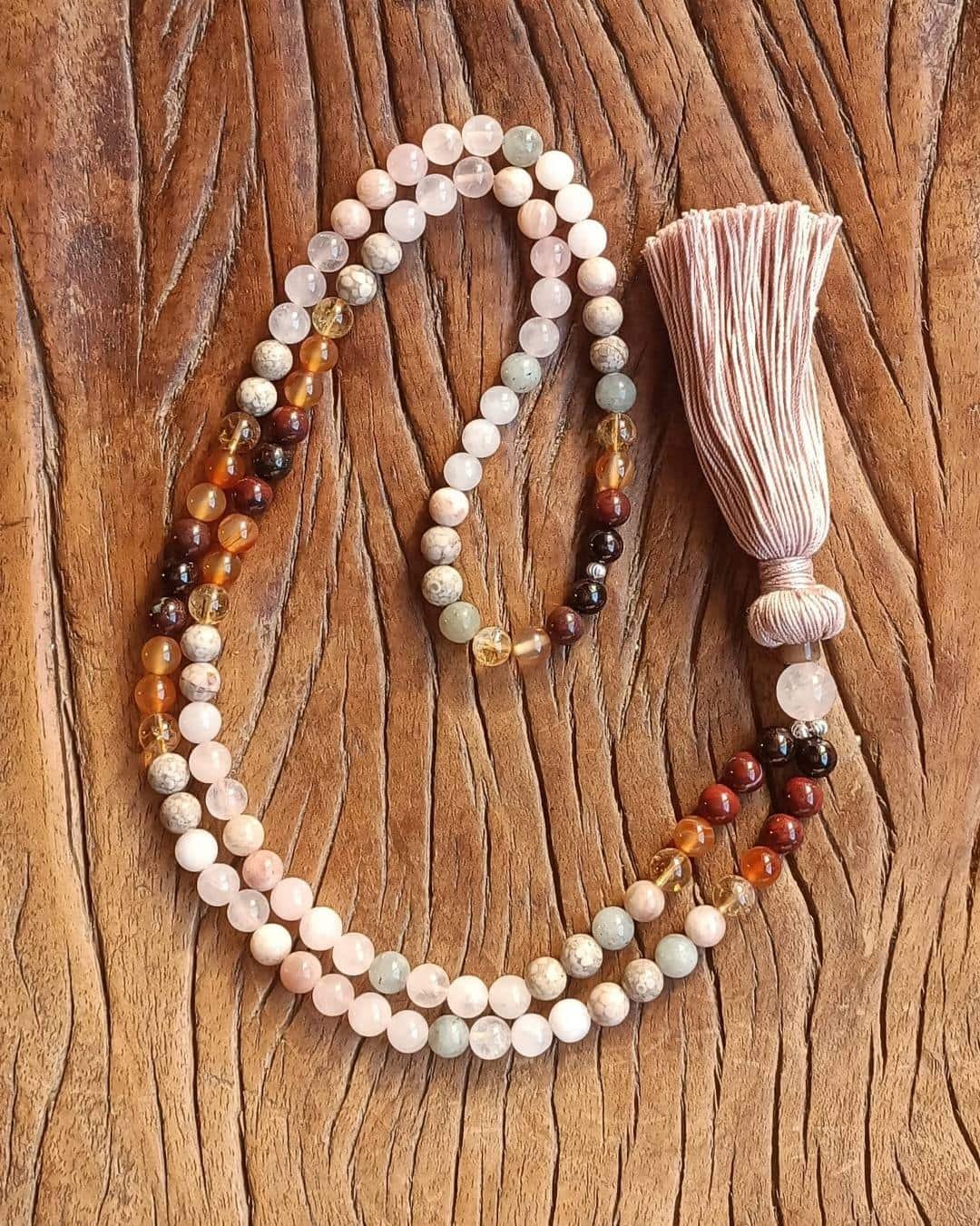 « La Vie en Rose » sublime les multiples facettes de l’énergie féminine. Minutieusement assemblé, ce précieux Mala vous reliera à l’amour inconditionnel, à la force vitale du principe féminin, ainsi qu’à votre intuition profonde et à la joie créatrice.