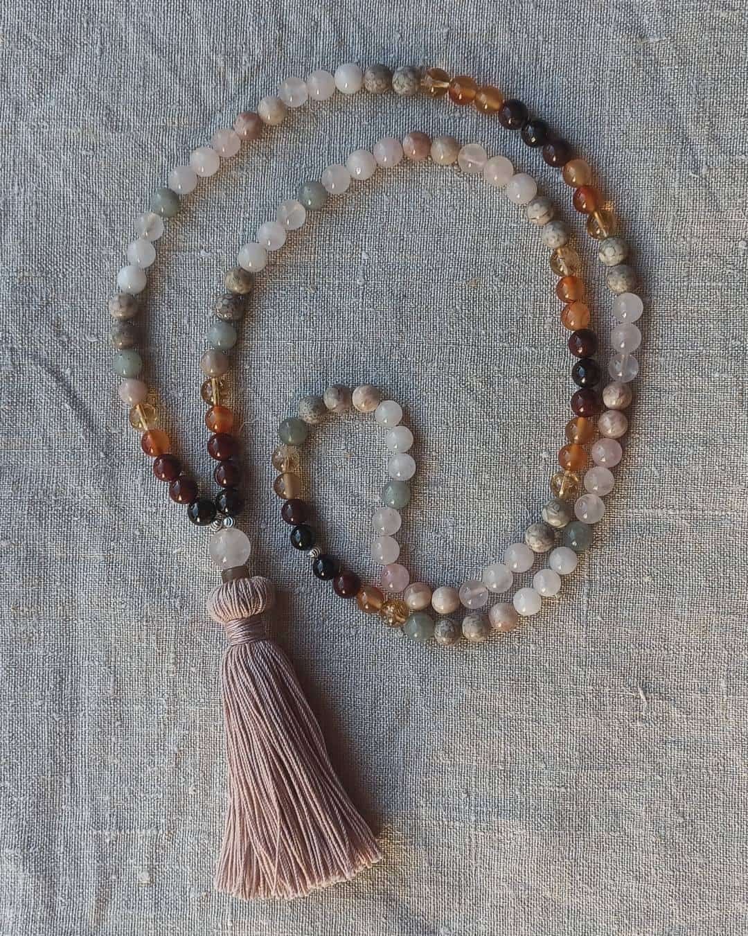 Chaque Mala « La Vie en Rose » est unique, créé avec respect et composé de matériaux naturels, qui peuvent donc présenter de légères variations de couleur et texture.